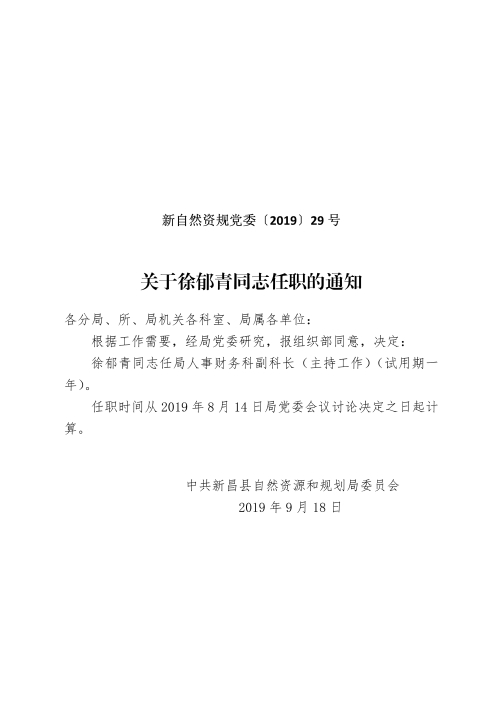 關(guān)于徐郁青同志任職的通知(新自然資規(guī)黨委〔2019〕29號)