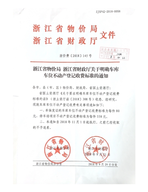 轉發《浙江省物價局浙江省財政廳關于明確車庫車位不動產登記收費標準的通知》