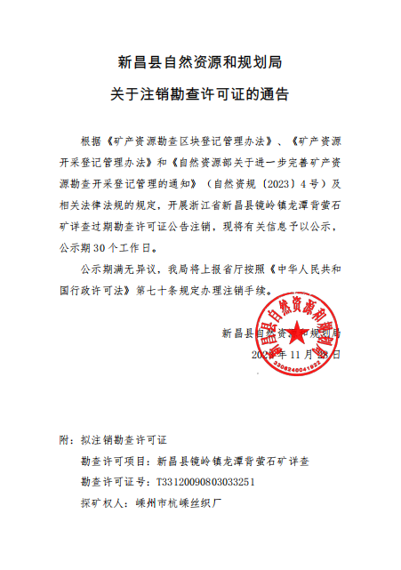 新昌縣自然資源和規(guī)劃局關(guān)于注銷勘查許可證的通告