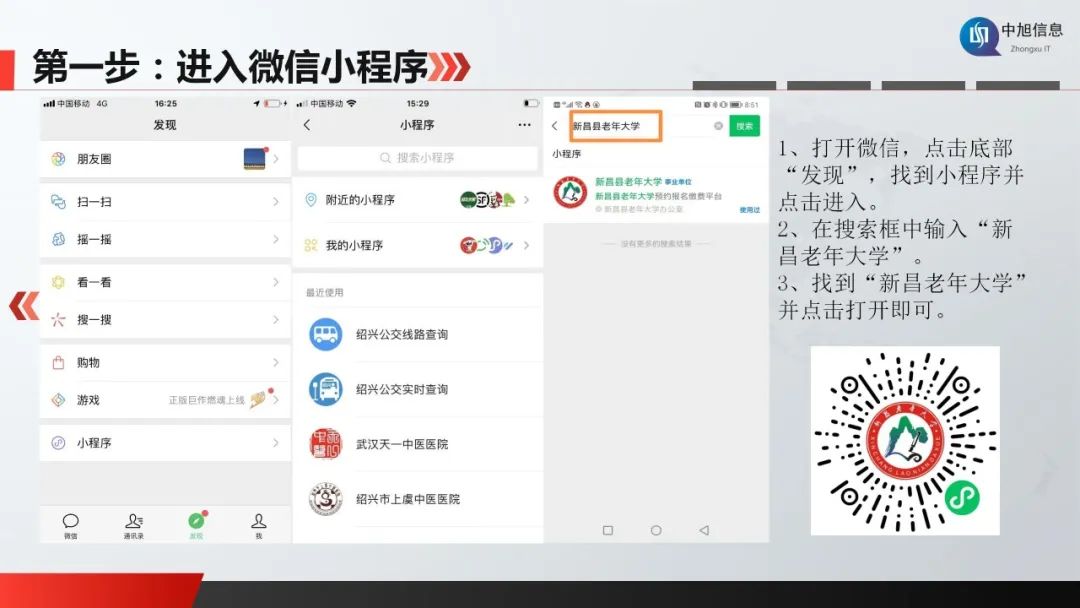 請在微信小程序搜索“新昌老年大學”或掃描下方二維碼,新學員點擊“立即注冊”先完成信息注冊再登錄報名,老學員直接輸入姓名和身份證號碼登錄報名。