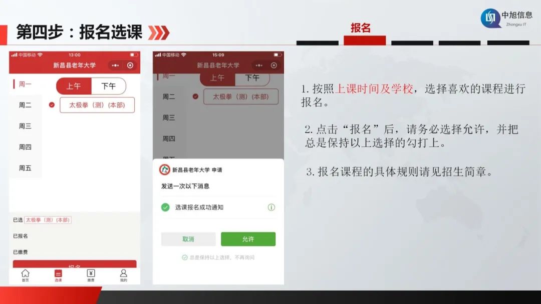 本次招生新老學員均可報名,新學員打開微信頁面下拉搜索小程序“新昌老年大學”,點擊“立即注冊”先完成信息注冊再登錄報名(新學員7月29日前完成信息注冊),老學員直接輸入姓名和身份證號碼登錄報名。新老學員登錄系統后進入選課,按上課時間及授課學校選擇課程報名,名額有限,額滿即止,報名結束后48小時內手機會收到繳費短信,憑繳款單號到浙里辦或支付寶搜公共支付進行繳費(務必在規定時間內完成)。