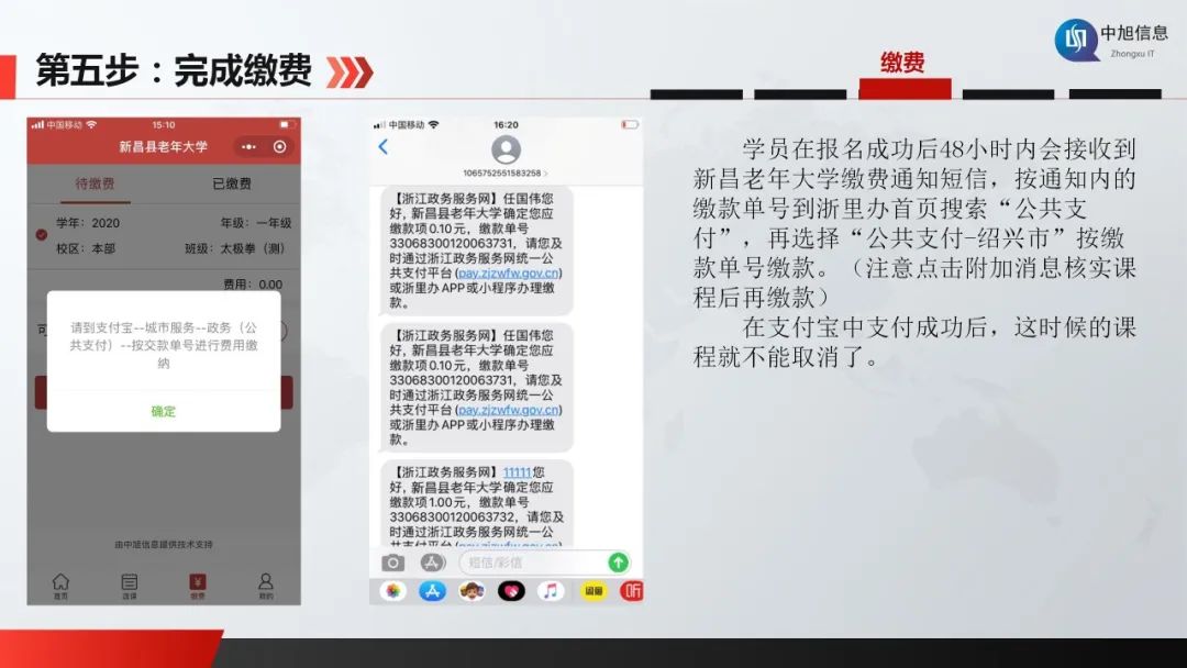 第三批報名對象為新學員和老學員,補報前兩批招生人數過半但仍有剩余名額的班級課程。學員登錄系統進入選課報名,對剩余名額進行補報,額滿即止,報名結束后48小時內手機會收到繳費短信,憑繳款單號到浙里辦或支付寶搜公共支付進行繳費(未按時完成繳費自動取消所報名額)。
