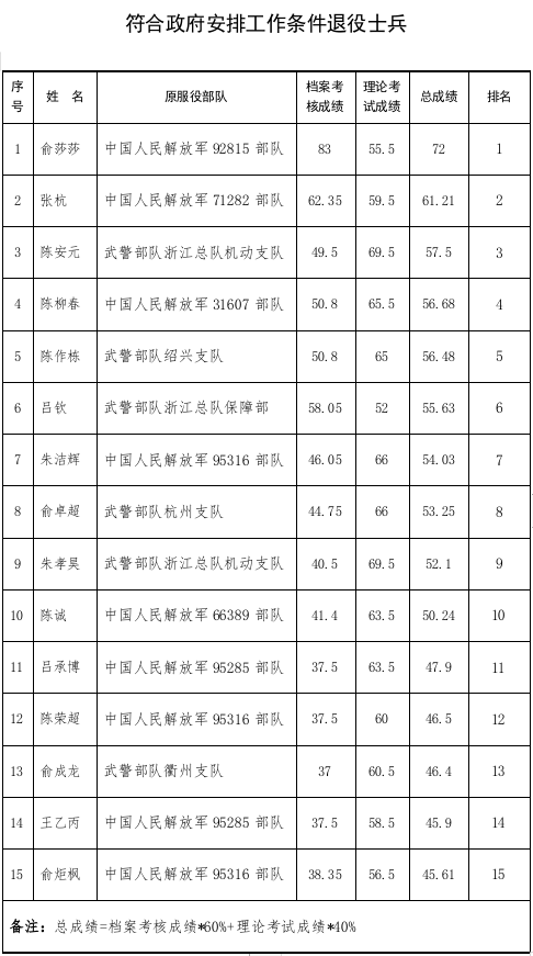 新昌縣2024年營職及以下軍隊轉業干部和符合政府安排工作退役士兵考試考核總成績排名公示