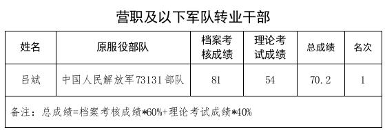 經匯總核算服役表現量化考核成績和理論考試成績,現將新昌縣2024年營職及以下軍隊轉業干部和政府安排工作退役士兵總成績及排名公示如下: